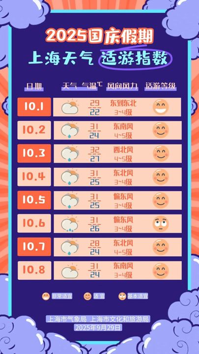 ■10月2日至5日,上海多云到阴为主,大部分时间没有雨水打扰,对旅游出行影响不大,白天最高气温预计为31℃~32℃。
